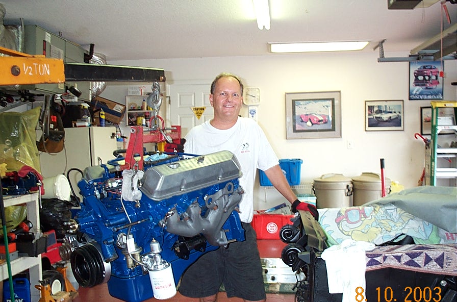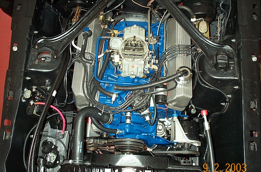 Installing the engine is a big event. I have been held up waiting for the exhaust manifold to be sand blasted. Finally got them back and coated. Turned out very nice, too back you can't see them when the big block fills up that engine bay. Looks fresh doesn't it. I had to install the engine 3 times to get it right. I forgot the right side manifold must not be on the engine, but must be in the engine bay before the engine goes in. No big deal though, just more fun! |