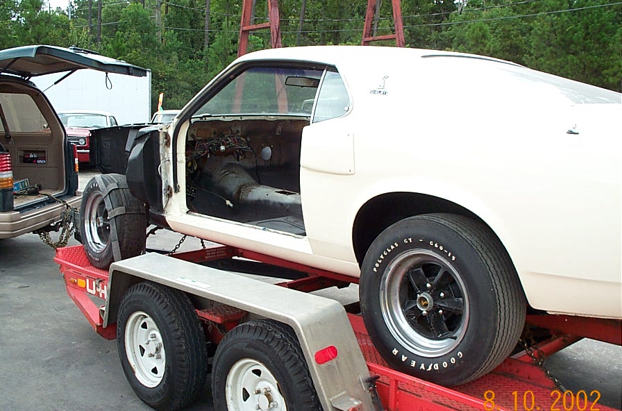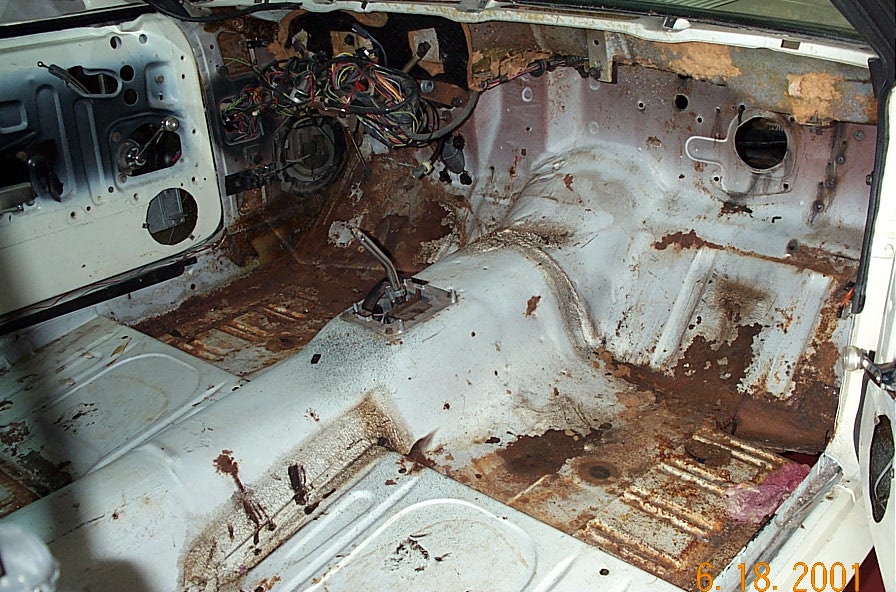 I have owned this Shelby since 1971. It was, like me, from Michigan. That is a good thing for me, but means something different for cars, namely rust. This project started as another bonding experience with my late father-in-law after completion of our Cobra replica project, which now resides in Paris. We just had the car painted and the interior needed a little sprucing up. I bought new carpet and upon removing the old I discovered rust in the floorpans. Not just pinholes, I mean big enough to put your fist through. I couldn't just cover the rust with new carpet or it would haunt my dreams, it had to be repaired. I contacted a local body shop for help, but couldn't find anyone who I felt was knowledgeable enough to do work to my standards. I search the Internet and discovered Don Barry's Mustang in Jacksonville. I was impressed with their knowledge of the process and the price was right. I made arrangements to take the car to them and have the floorpans, torque boxes and underside made rust free. This photo is what Don Barry's shop started with.