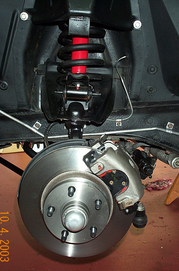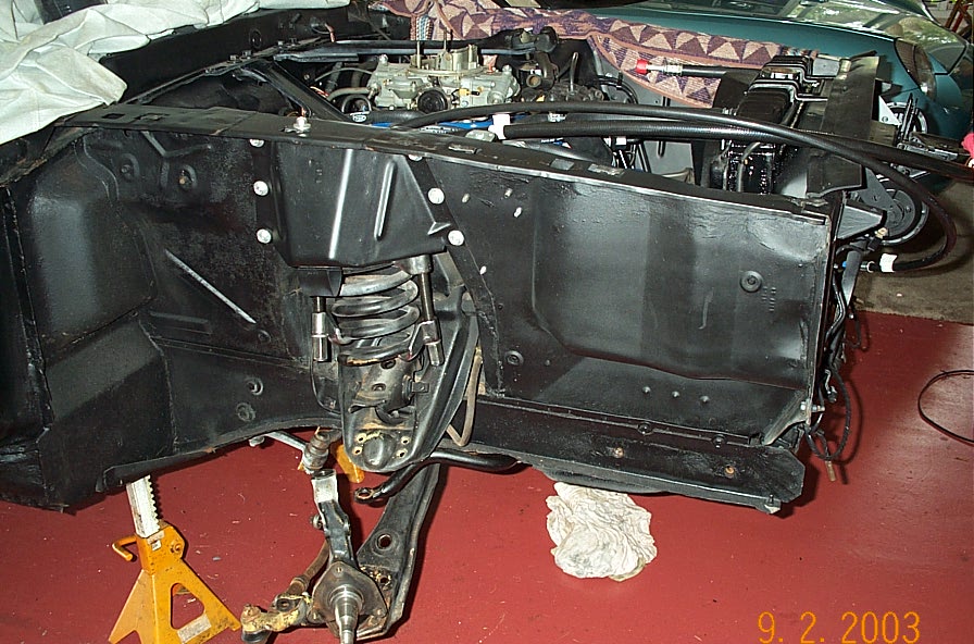 LABOR DAY Some progress is being made now. The engine is back where it belongs, between the fenders. The carb looks shiny and newly rebuilt. All the air conditioning parts are new, belts, hoses, condenser and dryer. All that's left is the compressor. That will require some more thought, R-12 or 134a. I'm leaning toward the new refrigerant but that means a different compressor. I'm getting real close to firing the beast up, even without an exhaust system. I got a little side tracked this weekend cleaning up the front suspension. |